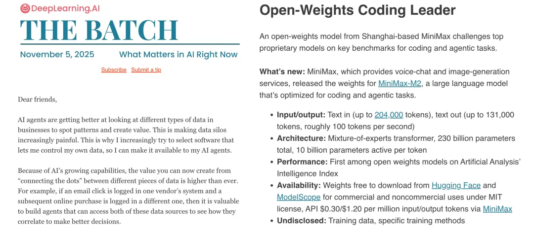 计算机科学家 Andrew Ng 的 AI 学习网站 DeepLearning.AI 周报中,用一张「智能 vs 价格」(Intelligence vs. Price) 图表将 M2 送上了「高智能、低成本」的最佳区间。 报告指出,GPT-5 等模型性能领先,但成本远远落后;而在成本、性能综合领先的区间中,MiniMax M2 与 Grok 4 Fast 难分伯仲。