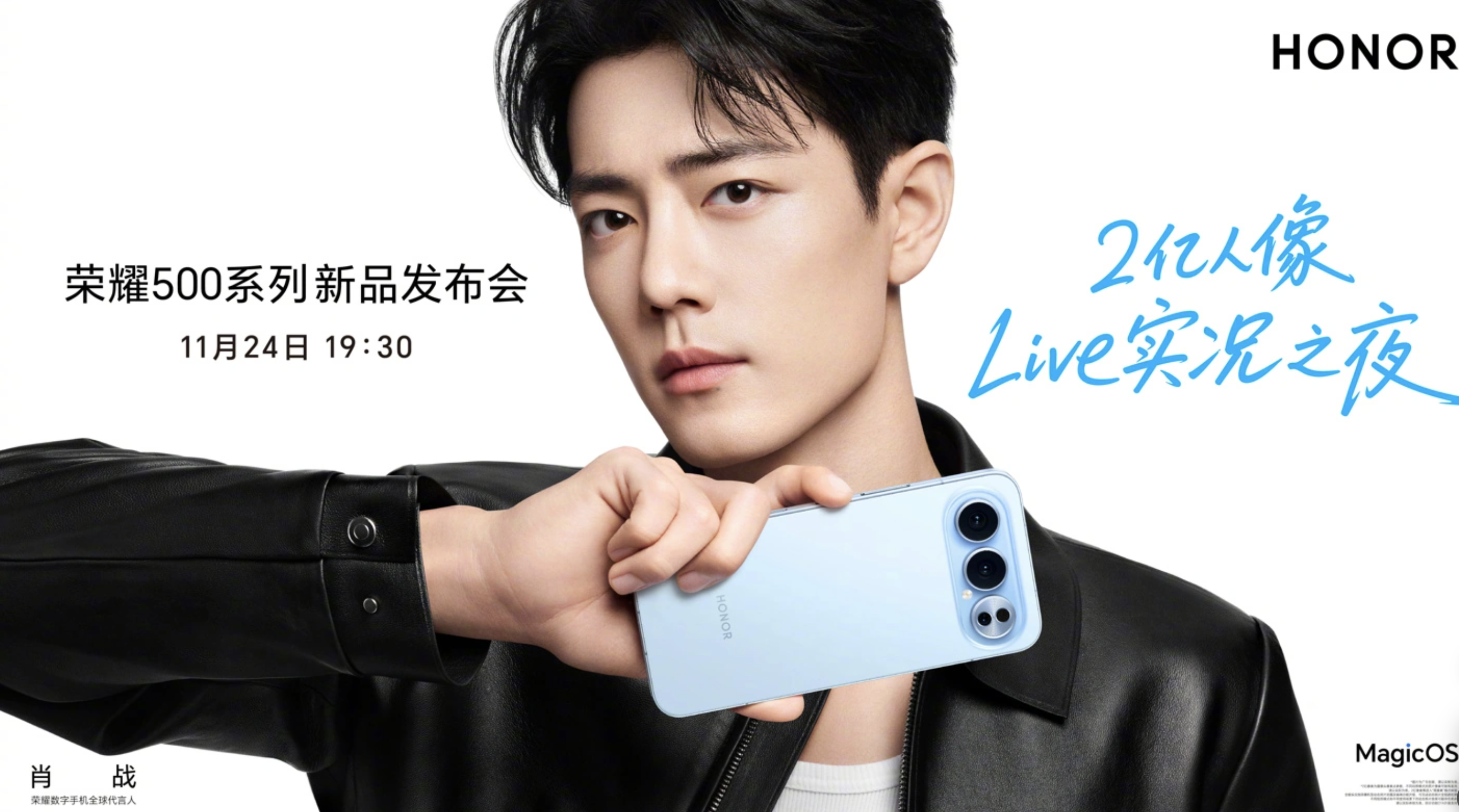 11 月 17 日消息,荣耀 500 系列新品发布会官宣定档 11 月 24 日 19:30,官方公布代言人为肖战。