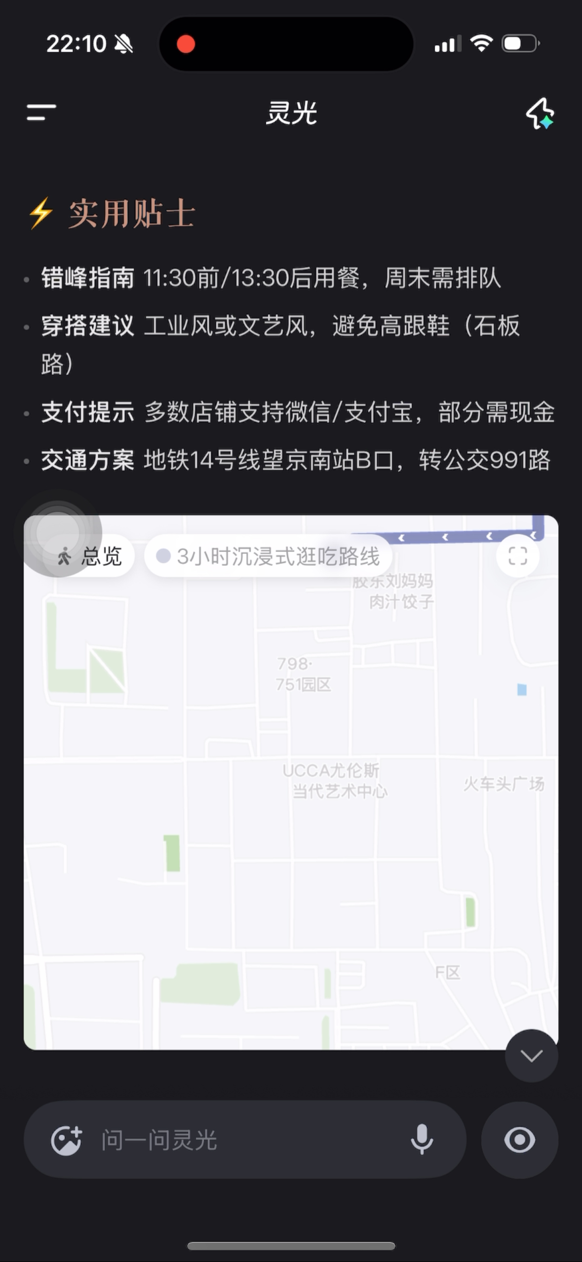 可以看到,「灵光对话」为我生成了一份「3小时沉浸式逛吃路线」,连从哪个门进入,几点到达能避开高峰期,全程要步行多久,路线几家店铺都包含了。