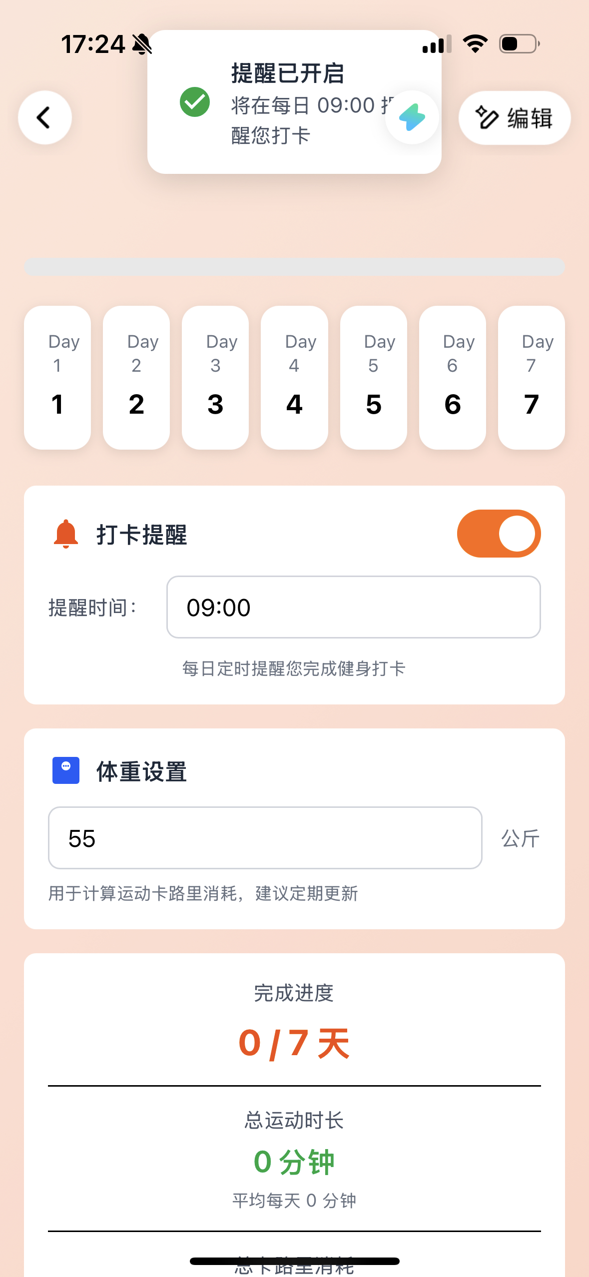 我顺势又尝试了创建另一个「7日健身打卡」应用,准备拿来督促自己在冬天运动一番。