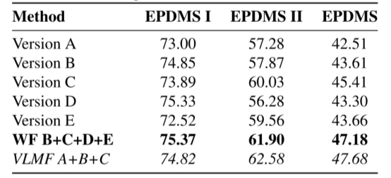 在轨迹融合策略的性能方面,通过融合策略,浪潮信息 AI 团队观察到了最显著的性能提升。WF B+C+D+E 在 Navhard 数据集上取得了 47.18 的 EPDMS 得分。最终,浪潮信息 AI 团队在 Private_test_hard 分割数据集上也使用了这四个评分器的融合结果。VLMF A+B+C 也取得了令人印象深刻的 EPDMS 47.68,但由于提交规则限制,未在最终的排行榜提交中使用此融合策略。