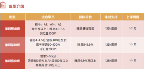 为满足不同英语水平和分数目标学员的需求, 课程设置了三大班型, 均采用 135 小时面授, 周期为 1 个月: