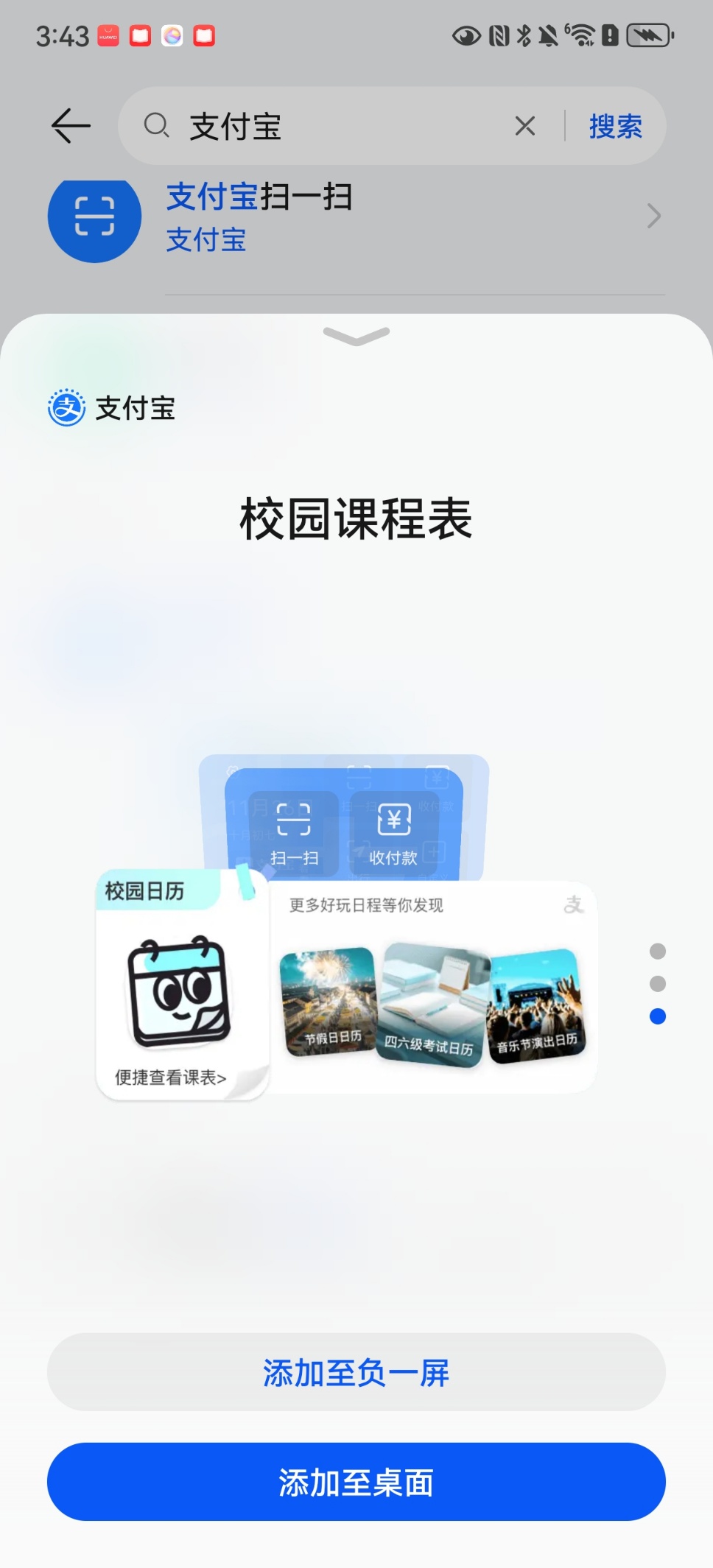 1、在华为负一屏顶部搜索框中输入「支付宝」「学生课表」或「学生课表添加」等关键词,直接定位并添加课程卡片;