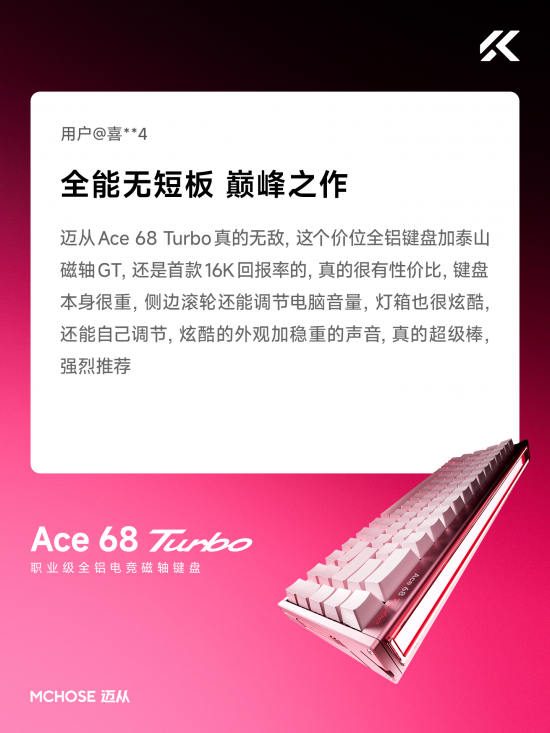 另一位资深外设玩家也给出高度评价:「迈从 Ace 68 Turbo 真的无敌,这个价位全铝键盘加泰山磁轴 GT,还是首款 16K 回报率的,真的很有性价比,键盘本身很有份量,侧边滚轮还能调节电脑音量,灯箱也很炫酷还能自己调节,炫酷的外观加稳重的声音,强烈推荐。」