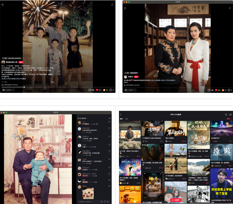 他们将内心深藏已久的遗憾过往通过 AI 平台进行再创作,帧帧光影中无数情感记忆得以被看见、被共鸣。这些亲情故事作品展现了亲子关系、父母与子女之间的爱与遗憾,为每一位观众提供了一个触动内心的体验,让亲情、爱与遗憾通过 AI 的力量重新得到诠释和延续。每个影像作品不仅是一段记忆的重生,也是对逝去时光的温柔怀念与敬意。以下是部分代表作品: