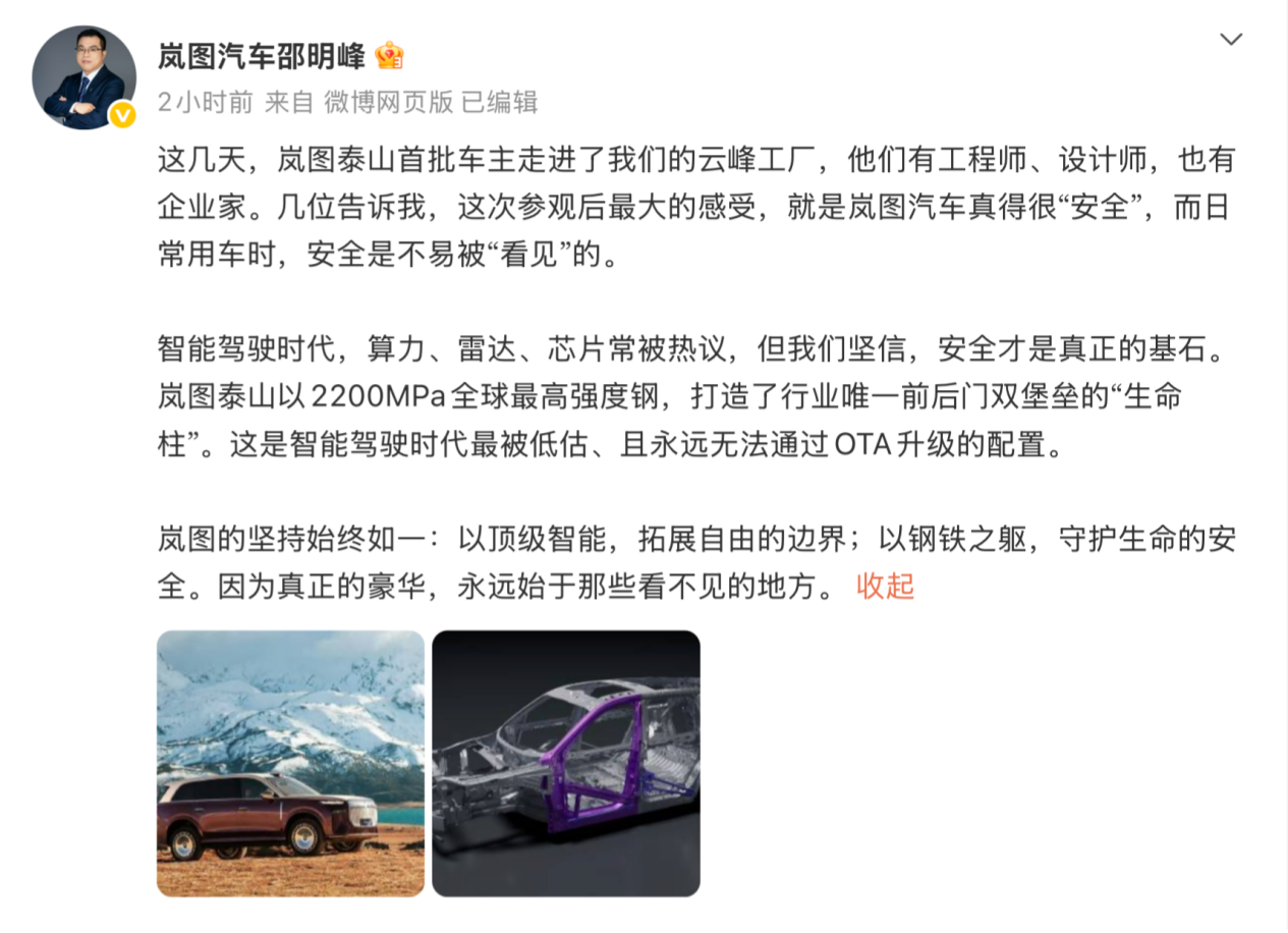 智能,决定了体验的上限;但安全,定义了生命的底线。这条底线,永远无法通过一次软件升级来补足。岚图泰山的 2200MPa「生命柱」 ,不仅是对材料的突破,更是对行业浮躁的一声警醒:在奔赴智能未来的路上,千万别忘了造车最原始的初衷——安全,是最大的豪华,也是一切科技得以闪耀的前提。