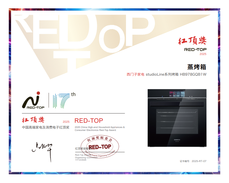 在中国高端家电领域具有权威影响力的「红顶奖」公布本年度获奖名单,西门子玄晶 Pro 智瞳 AI 烤箱凭借其兼具先锋设计理念与卓越工程品质的产品表现成功获奖。作为国内高端家电行业的重要风向标,红顶奖对设计、科技、品质及用户体验进行全方位评审,获奖作品需在行业创新性与消费价值上具备领先实力。此次获奖不仅是对西门子家电设计与研发能力的肯定,也再次证明品牌在高端厨电市场中的持续引领地位。