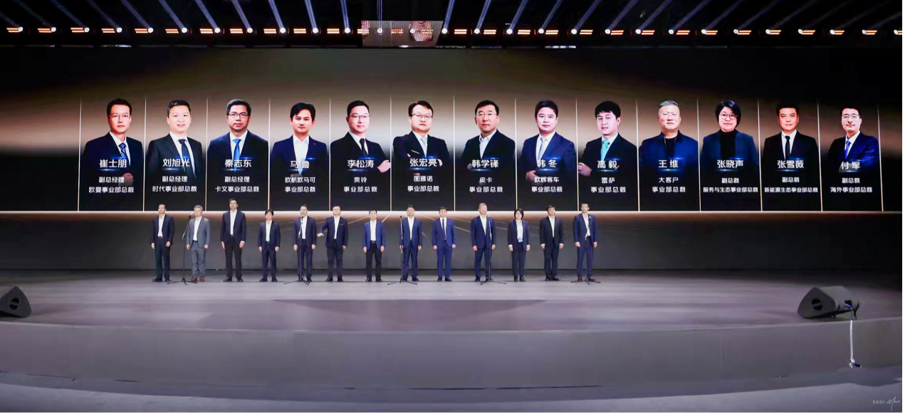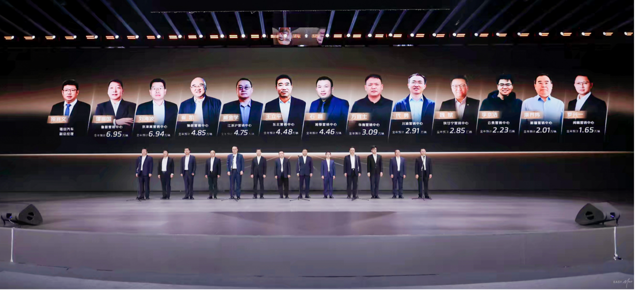 2026 年目标的达成,离不开业务端与区域端的协同攻坚。大会伊始,13 位事业部总裁与 13 位区域营销中心负责人(含 12 位中心总经理及分管领导)集体亮相,展现了福田「主力作战部队+战区支援中心」的矩阵式作战体系。作为福田与合作伙伴结成的「发展与利益共同体」,这支核心团队既是战略落地的关键抓手,也是赋能渠道、联接伙伴的坚实桥梁,他们将带领团队践行「敢于竞争、敢于胜利」的宣言,推动营销变革、渠道优化、政策落地等举措直达终端,为全年销量增长与高质量发展提供坚实保障。