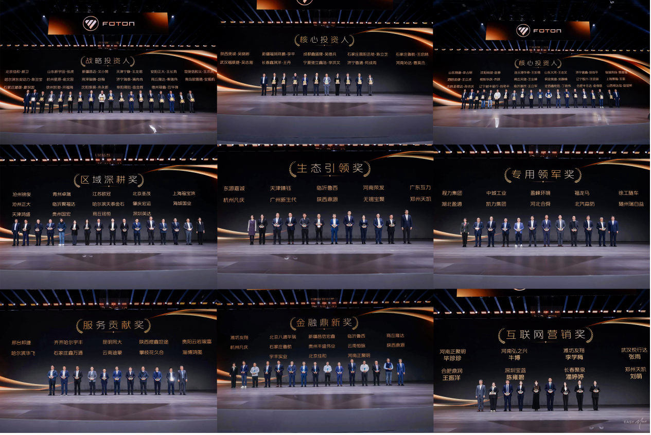 为凝聚合作伙伴共创未来的信心与决心,福田汽车常务副总经理鹿政华主持了核心投资人和战略投资人授牌仪式,现场为 45 位长期与公司同频共振的战略及核心投资人授牌,他们将获得"专属政策支持、专业人才培养、战略协同共创"等全方位赋能。同时,大会还对全年表现优异的经销商分别授予"区域深耕奖"、"生态引领奖"、「专用领军奖」、"服务贡献奖"、「金融领航奖」、「互联网营销奖」荣誉。