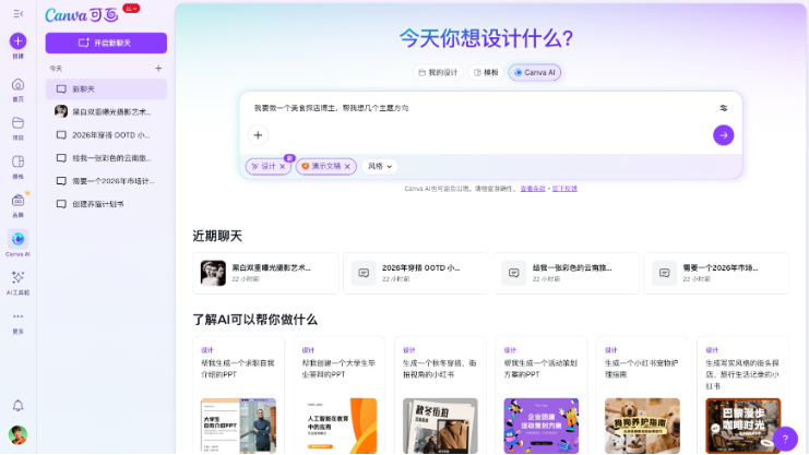 这种深度的本地化,为 AI 的接入提供了最肥沃的「数据土壤」。这次全新上线的 Canva AI,核心亮点是将分散的 AI 能力收拢进了一个极简的入口——对话框。具体包含以下三点: