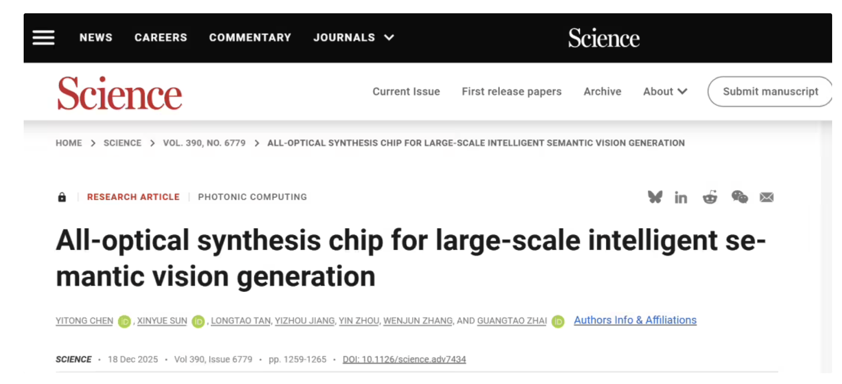 相关研究于 12 月 19 日以「All-optical synthesis chip for large-scale intelligent semantic vision generation」(大规模智能语义视觉生成全光芯片)为题发表于国际顶级学术期刊《科学》(Science)上。上海交通大学为论文第一作者和通讯作者单位,陈一彤助理教授为第一作者及通讯作者。