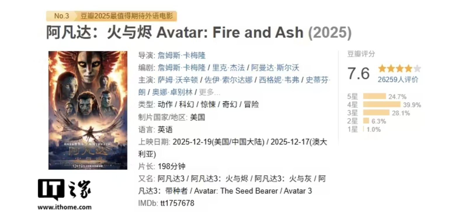 科幻电影《阿凡达 3》今日上映,豆瓣开分 7.6 为系列最低