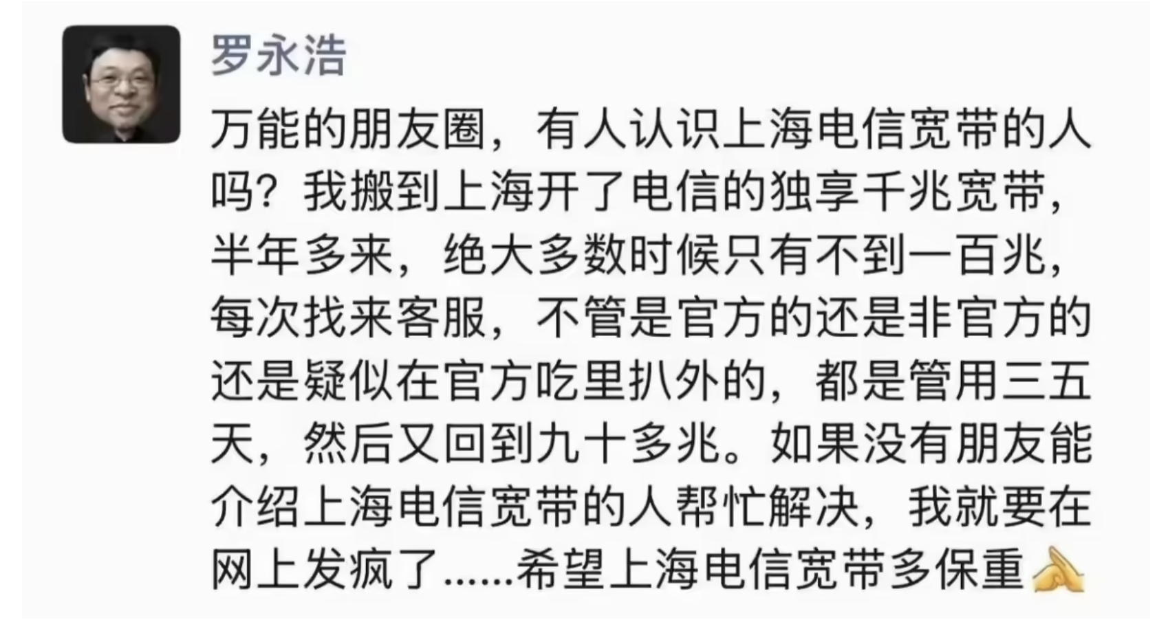 罗永浩 12 月 18 日在朋友圈吐槽上海电信网速问题。罗永浩表示,其搬至上海后开通电信独享千兆宽带服务,然而自办理以来的半年多时间里,宽带实际速率绝大多数时候仅有不到一百兆。