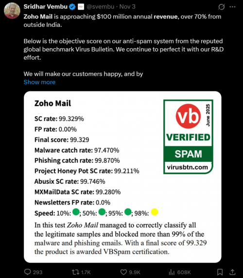 临近岁末,Zoho 创始人斯瑞达•温布在社交平台 X 上公布了则好消息,Zoho 旗下邮箱产品 Zoho Mail 年度营收即将突破 1 亿美元大关 (约合人民币 7 亿),其中 70% 的市场份额来自北美、欧洲及亚太。这也是其继 Zoho CRM 后,又一有望实现营收过亿 (美元) 的企业级超级单品。