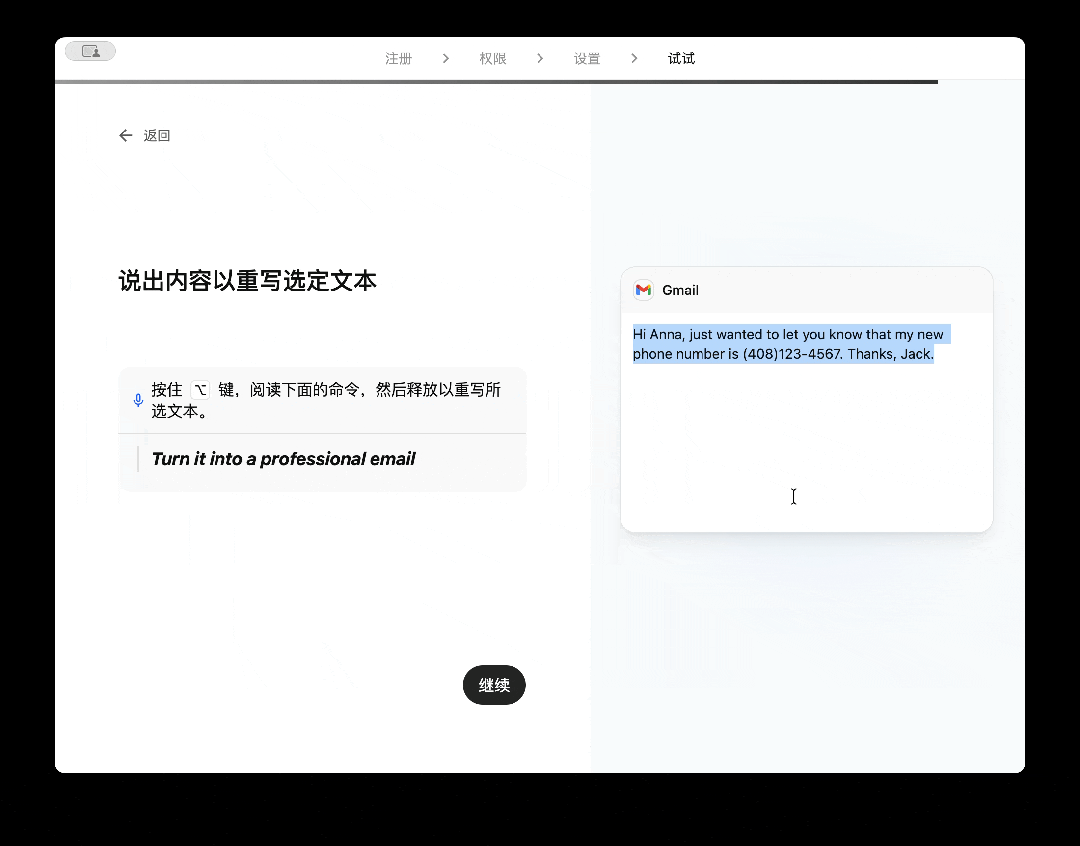 又比如,我在 Gmail 里选中一段略显随意的英文邮件,只需要对着 Typeless 说一句「Turn it into a professional email」,它会在原地把那段话改写成一封语气、结构都更正式的邮件正文。