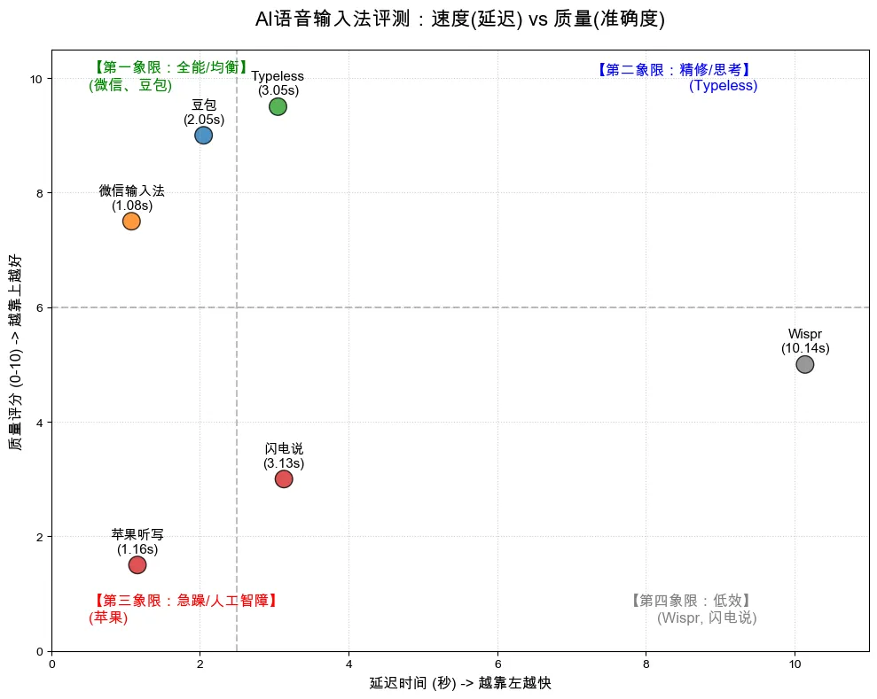我之前曾经简单测试过各个语音输入法,并做了一张四象限图。Typeless 处于第二象限:速度中上,但文字的质量最高。|图片来源:极客公园