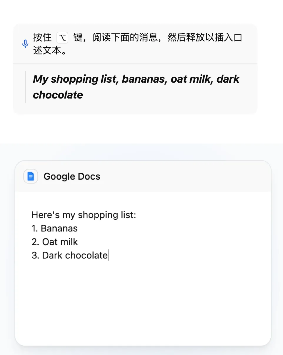 这些「理解意图」的能力,在具体功能上体现得很直观。比如说,我随口一句「My shopping list, bananas, oat milk, dark chocolate」,在 Typeless 里看到的,不是一串用逗号隔开的原话,而是自动帮我排好的一份购物清单:前面有标题,下面是 1、2、3 的编号列表。