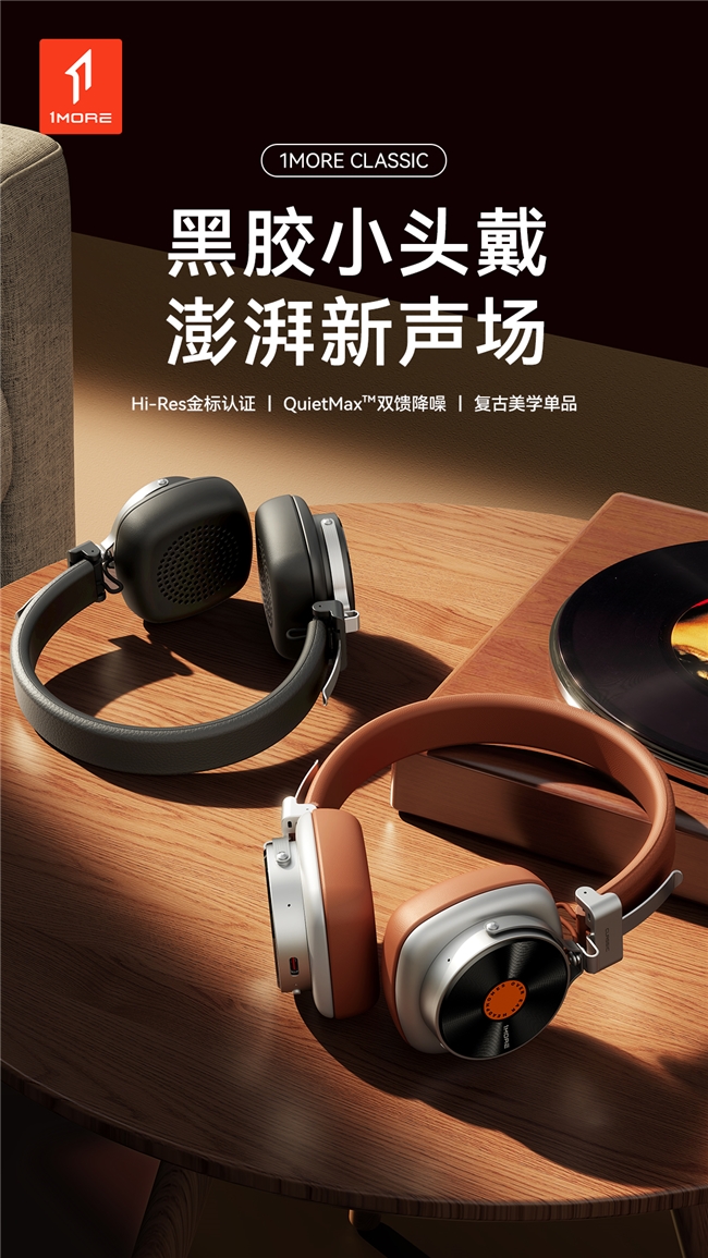 凭借对音频技术的深耕与潮流美学的敏锐洞察,专业音频品牌 1MORE 万魔再度发力,推出兼具复古质感与硬核性能的新品——1MORE 黑胶复古头戴耳机 HQ36。这款融合了经典设计与现代科技的潮搭单品,不仅以黑胶唱片为灵感打造吸睛造型,更搭载 Hi-Res Wireless 金标认证音质与深度降噪技术,为音乐爱好者带来好看与「声」俱来的沉浸式聆听体验。