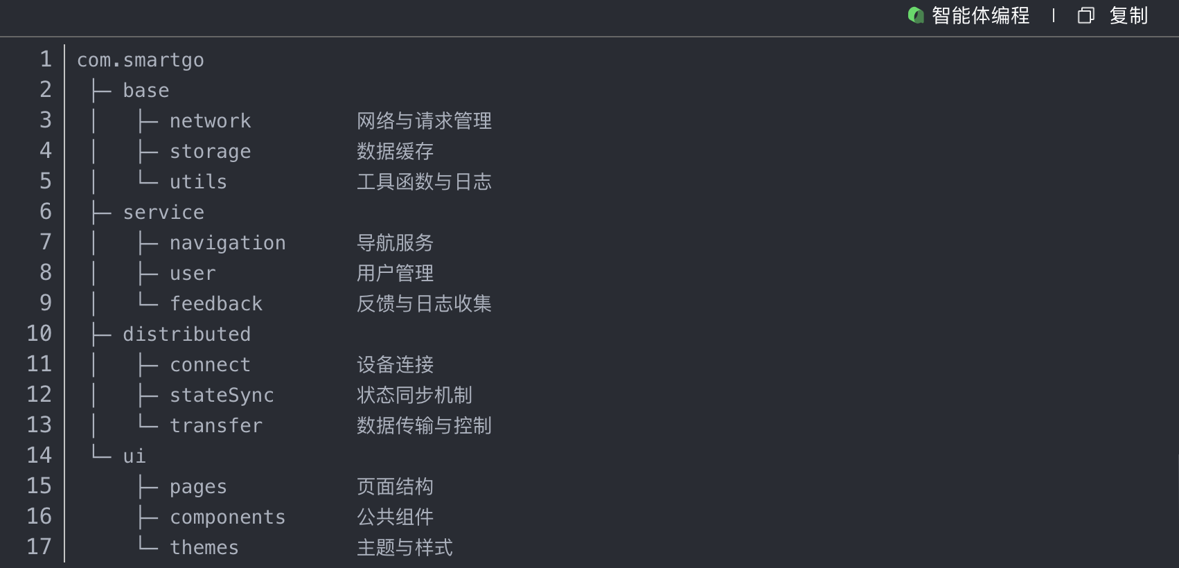 与传统 Android 或 iOS 项目不同,HarmonyOS 应用需要兼顾多设备协同。为此,SmartGo 的架构设计核心思路包括模块化分层设计,便于功能拆解与并行开发;状态共享机制,保证多终端状态同步;以及分布式通信封装层,抽象设备互联逻辑,避免代码耦合。