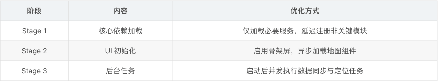 优化措施包括延迟加载(Lazy Load),将地图模块初始化放入 Stage 2;资源预加载(Preloading),在后台提前解压语音包;以及骨架屏机制(Skeleton Screen),在 UI 渲染前展示轻量骨架,提升主观速度。