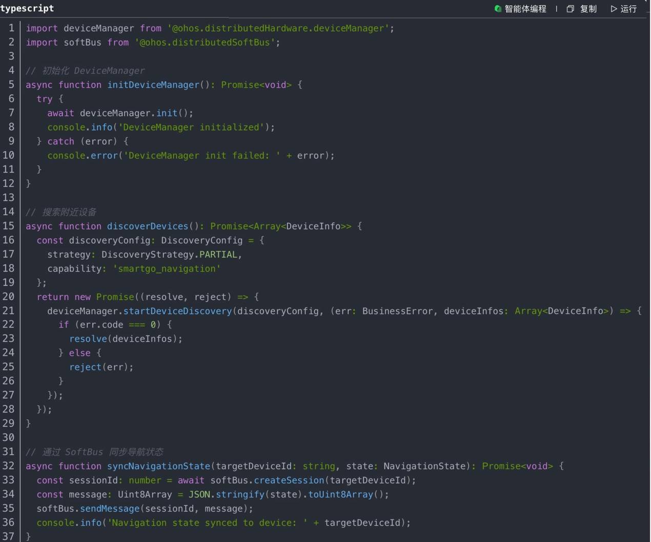 SmartGo 的核心亮点是实现「手机规划 → 车机接力 → 手表监控」的分布式导航体验。利用分布式软总线(Distributed SoftBus),我们实现了如下流程:手机端通过 DeviceManager 搜索附近设备;使用 SoftBus 建立安全信道;将导航状态(路线、语音进度、目的地)同步至车机端;用户上车后自动切换终端,继续导航。