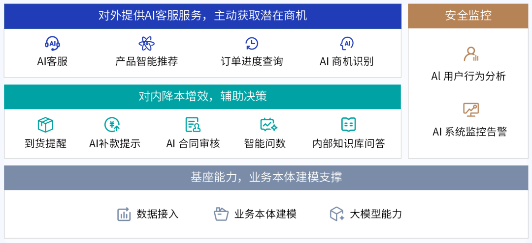 短期聚焦客户增长,上线 AI 客服、智能推荐、订单查询、商机识别、智能问数,直接赋能前端销售,提升客户体验与转化效率,快速拉升业绩。