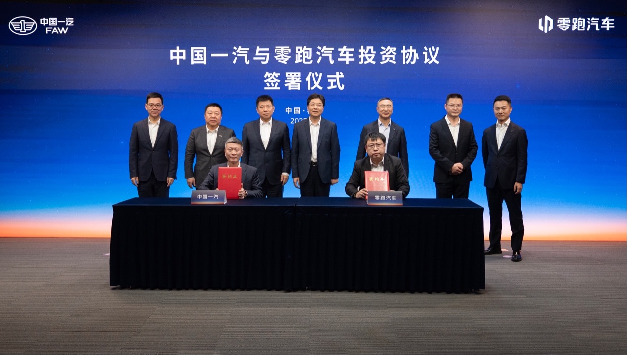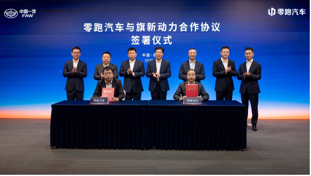 2025 年 12 月 28 日,中国一汽与零跑汽车在杭州举行签约仪式,中国一汽全资子公司一汽股权投资(天津)有限公司(下称「一汽股权」)和一汽旗新动力(长春)科技有限公司(下称「旗新动力」)分别与零跑汽车签署投资协议和合作协议。杭州市委副书记、市长姚高员,中国一汽党委副书记、总经理刘亦功,零跑汽车创始人、董事长兼 CEO 朱江明出席仪式并共同见证签约。