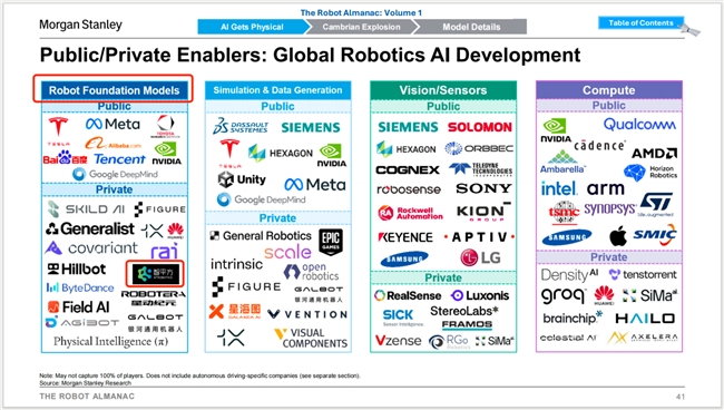 在这份定调行业走向的报告中,大摩关注的并不是「谁更会做机器人」,而是谁在构建下一代机器人的智能底座。