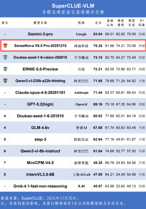 12 月 29 日,权威大模型评测基准 SuperCLUE 发布《中文多模态视觉语言模型测评基准 12 月报告》,商汤日日新 V6.5(SenseNova V6.5 Pro)以 75.35 的总分位列国内第一,斩获金牌,并在视觉推理维度上拿下国内最高分。