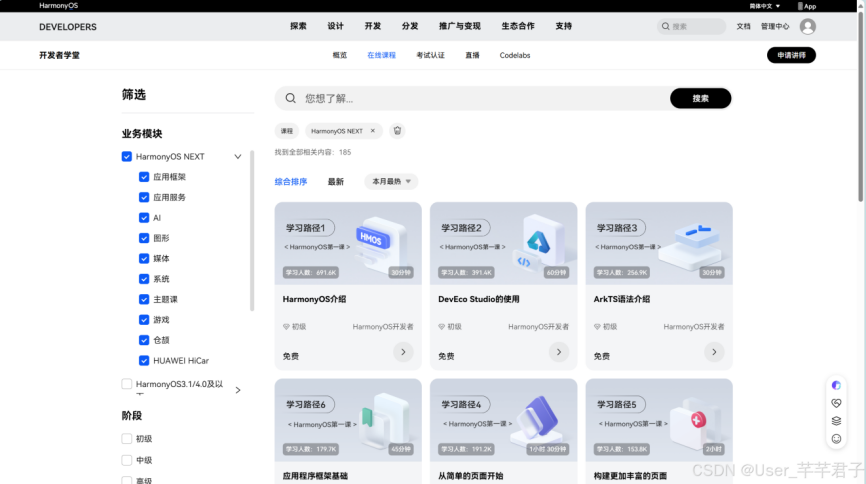 华为官方提供了鸿蒙(HarmonyOS)开发者学堂,包含系统化的课程和文档,适合从入门到进阶的学习需求。平台涵盖 HarmonyOS 应用开发、设备开发、分布式技术等核心内容,并提供实战案例和在线实验环境。