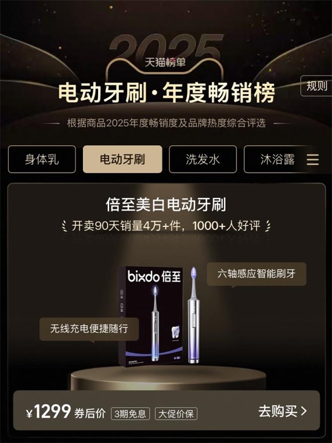 此外,根据天猫榜单 2025 年度畅销榜(2025 全年消费者在天猫平台的真实消费数据), 倍至美白电动牙刷也在电动牙刷品类中,夺得榜首位置。