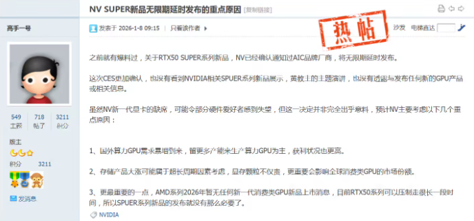 1 月 9 日消息,版主「高手一号」昨日(1 月 8 日)在博板堂发帖,透露英伟达已经通知合作伙伴无限期搁置 RTX 50 SUPER 系列显卡的发布计划,甚至可能彻底取消该产品线。