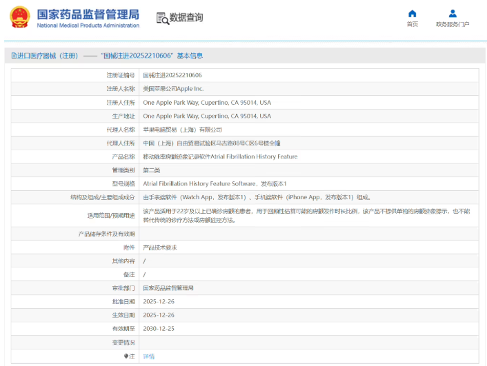 IT 之家查询获悉,该功能的注册名称为「移动脉率房颤迹象记录软件」,于 2025 年 12 月 26 日正式获批。