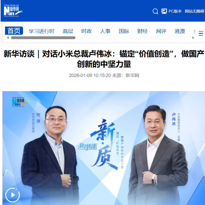 1 月 9 日消息,新华网今日发布对小米集团合伙人、总裁、手机部总裁、小米品牌总经理卢伟冰的访谈,回顾 2025 年小米在手机、芯片、汽车等领域的「创新井喷」与实力质变,并直面高关注度下的成长阵痛。