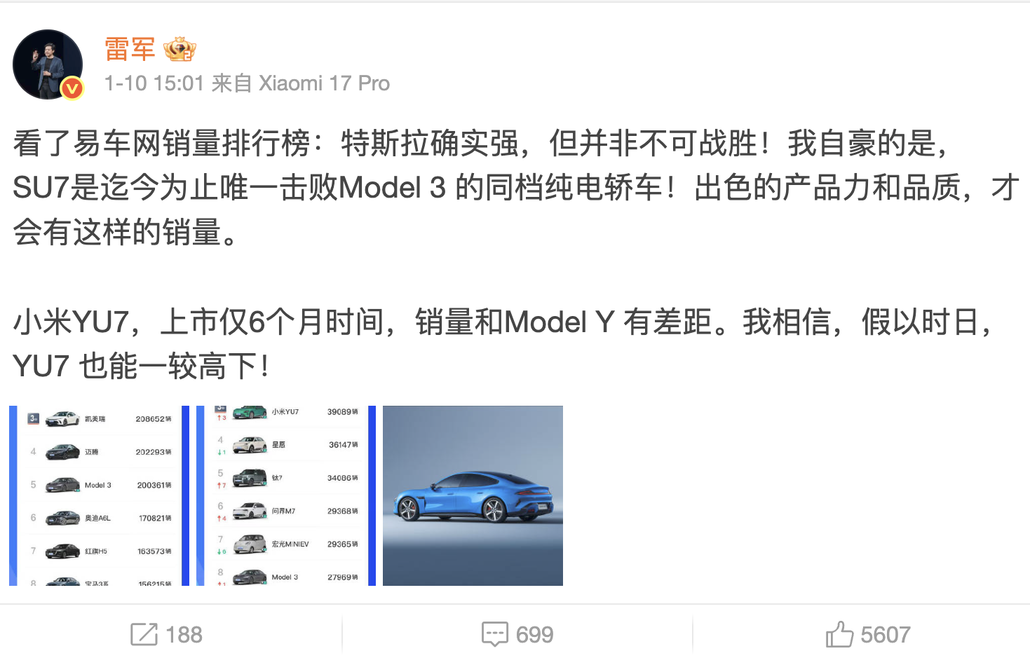 1 月 10 日,雷军发文晒易车网销量排行榜,同时表示,「特斯拉确实强,但并非不可战胜。」