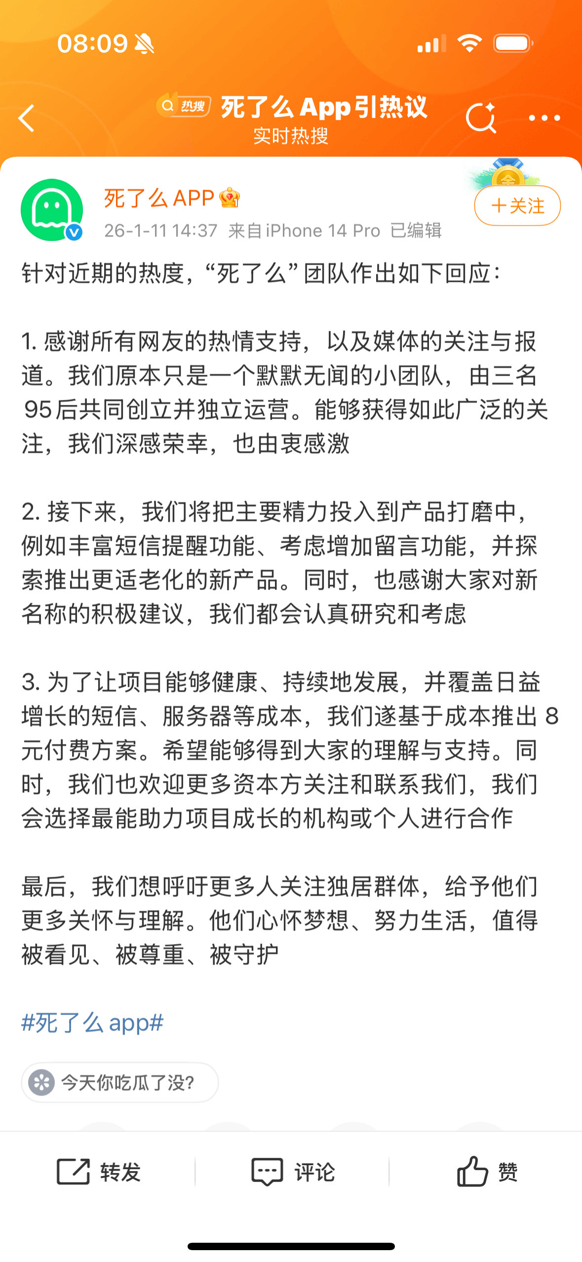 独居安全 App「死了么」团队回应近期热度:深感荣幸、由衷感激,接下来主要精力将投入产品打磨