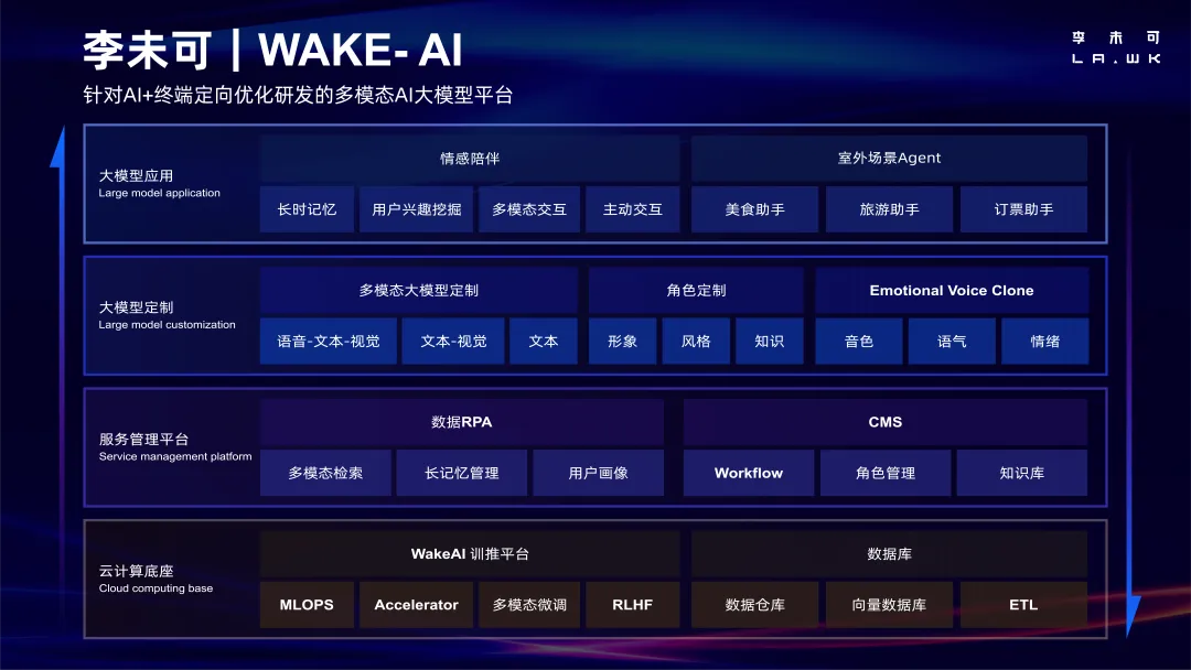 实现这一切的背后,是李未可全面升级的「超能李未可」系统。基于自研 WAKE-AI 大模型基础,采用多智能体协同的「群体智能」模式,协同 20+主流大模型与 70+智能体,根据任务的复杂程度实现动态调度与决策,完成从「即时应答」到「深度协同」的无缝衔接。通过端到端的任务理解与执行闭环,使系统能够自主完成从指令解析、规划拆解到结果交付的全过程。