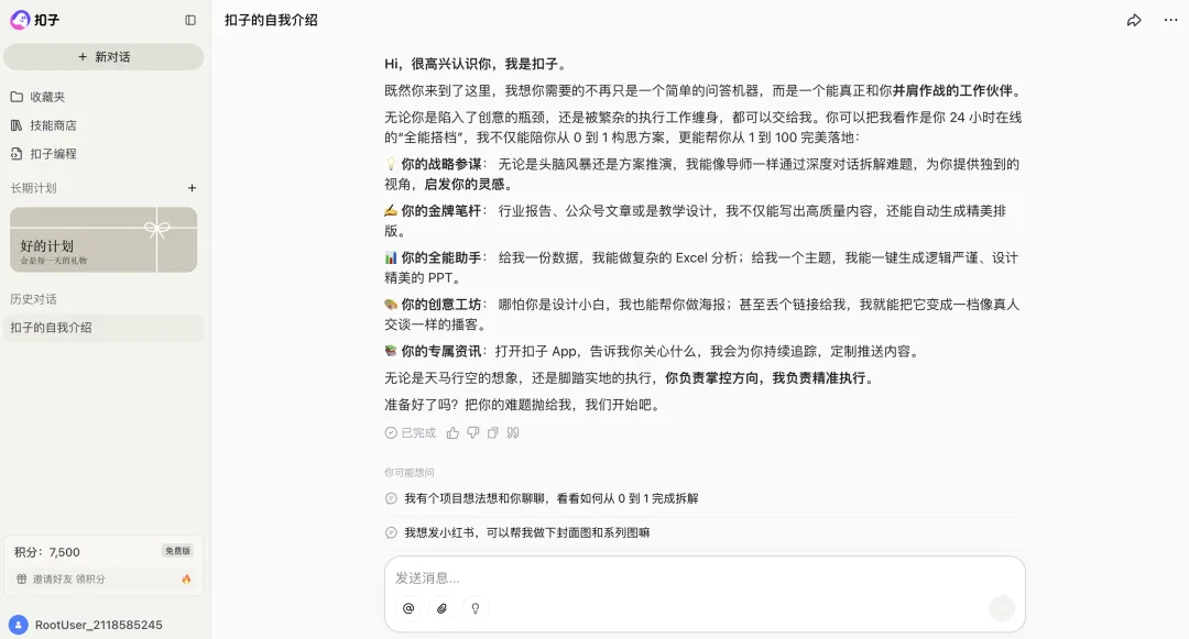 扣子 2.0 的用户主界面,左侧包含了技能商店、扣子编程、长期计划的入口,右侧是对话框|图片来源:产品截图