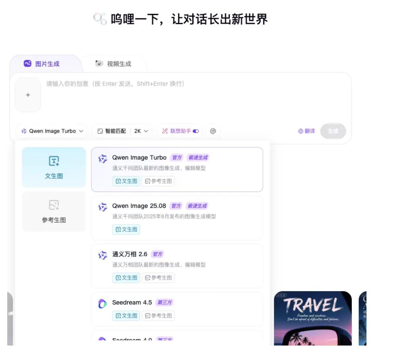 平台深度整合了通义千问团队研发的多款图像大模型,形成一个模型全家桶。其中包括主打高质量的 Qwen Image25.12 生成模型、追求极致响应速度的 Qwen Image Turbo 模型,以及专注于细节调整的 Qwen Image25.11 编辑模型。用户可根据不同创作需求,在生成质量、速度与可控性之间灵活选择。