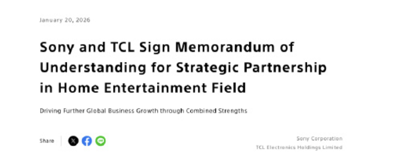 1 月 20 日,Sony 与 TCL 宣布签署合作谅解备忘录(MOU),将推进成立家庭娱乐领域合资公司:TCL 持股 51%,Sony 持股 49%。