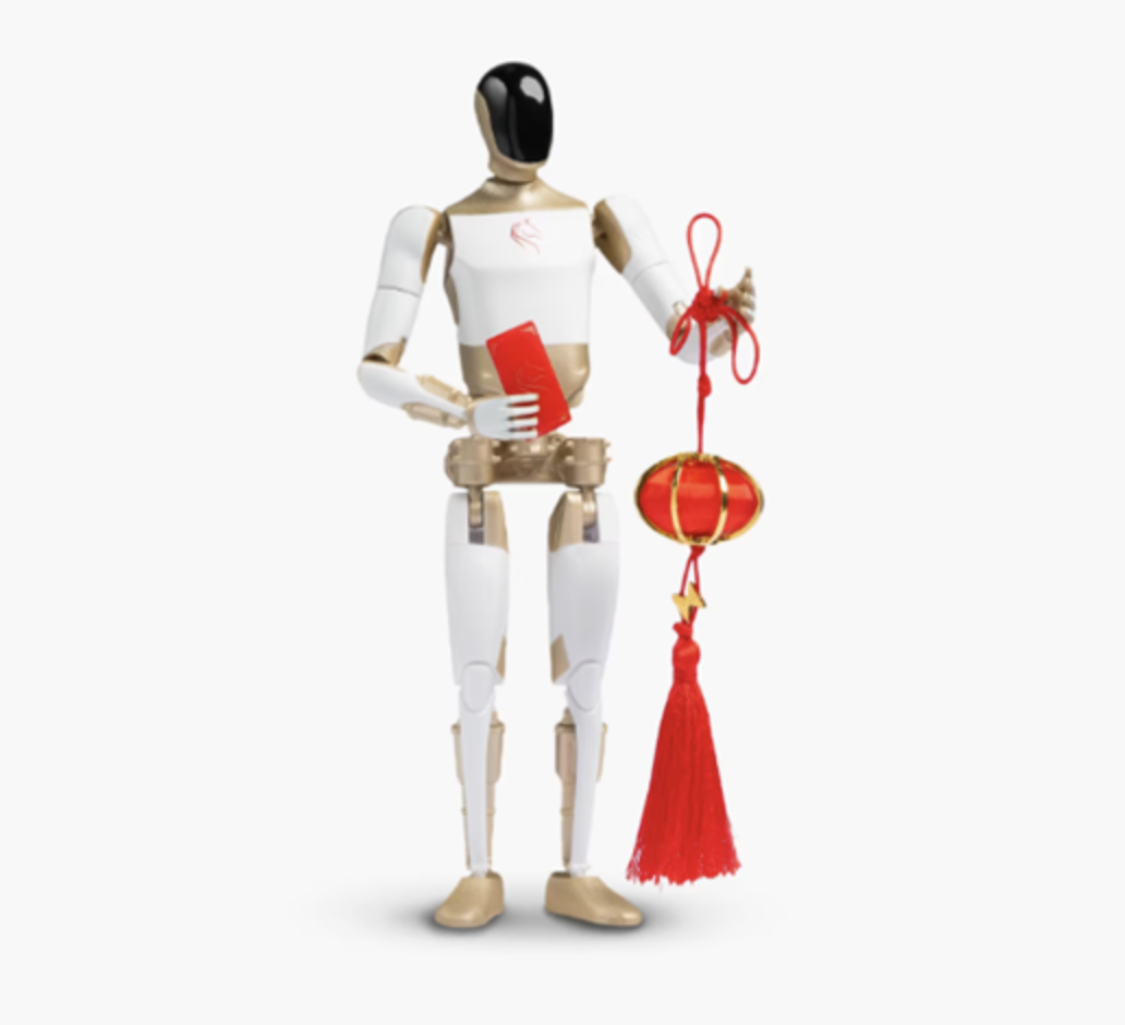 产品尺寸为 5.5cm x 18.2cm,净重约 25 克。无论是外观细节还是动作表现,均高度还原第二代人形机器人。用户可以自由调整摆件姿势,如双手抱拳的拜年造型、手持节日道具的俏皮模样。