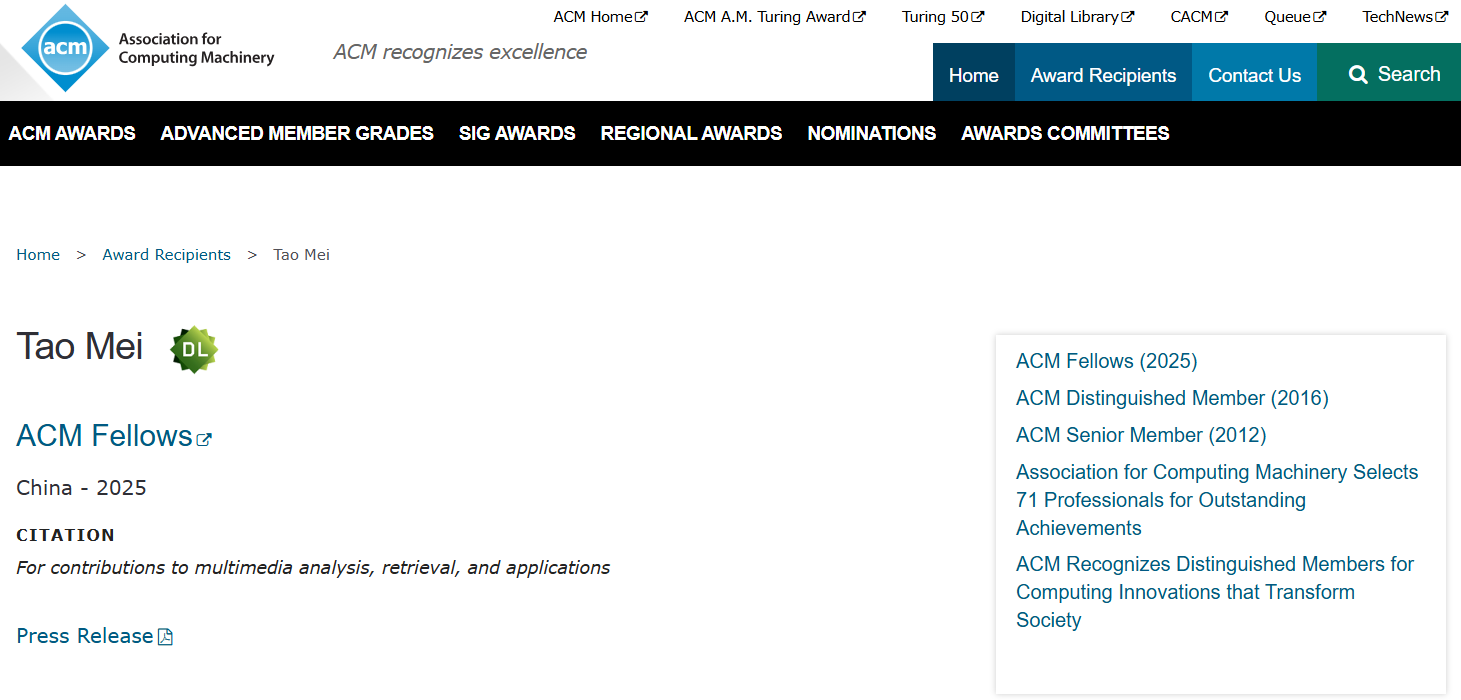 1 月 21 日,国际计算机学会(Association for Computing Machinery,ACM)公布 2025 年度 ACM Fellow 名单,智象未来创始人兼首席执行官梅涛博士成功当选 2025 ACM Fellow。