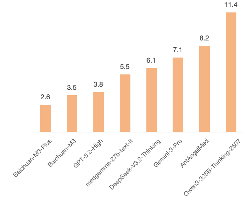随着上周百川M3大模型的正式开源,这一局面已被彻底打破。M3不仅在 Healthbench、Healthbench Hard 等多个权威评测中登顶榜首,实现了对 GPT-5.2的全面超越,更在 OpenAI 引以为傲的低幻觉领域完成超越,以3.5%的幻觉率领跑全球。