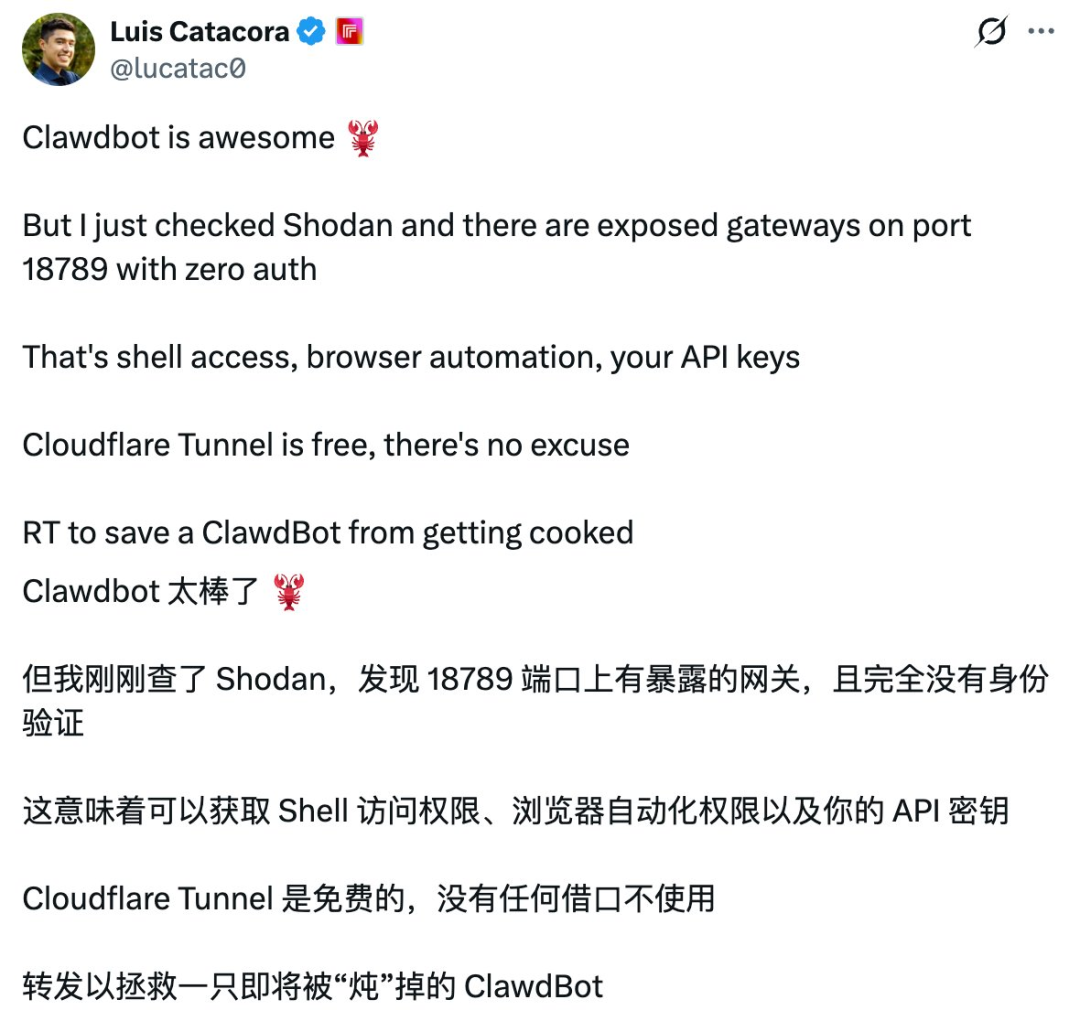 随着越来越多用户深入研究,Clawdbot 的漏洞也随之被发现|图片来源:X