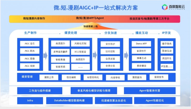 百度智能云此次发布的 AI 漫剧行业解决方案,聚焦「从创意到成片」的全链路能力整合,覆盖剧本生成、分镜拆解、角色与场景设定、画面生成、动态演绎、配音配乐及内容管理等核心环节。通过模型能力与行业工具链的结合,原本高度依赖人工分工的制作流程正在被拆解和重组,使创作团队能够以更轻量的方式完成高频内容生产。