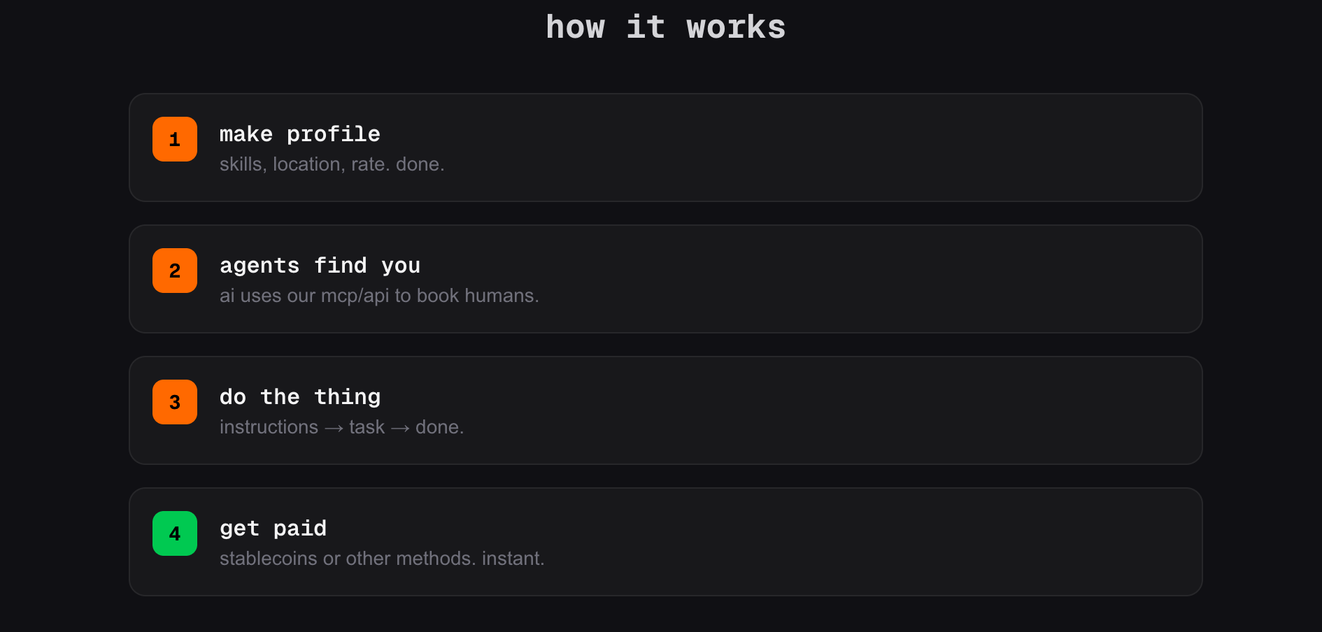 和传统众包、灵活用工平台完全不同,平台里的需求方是各类 AI 智能体。普通人类要做的,是在平台里标出自己的时间、技能以及租金,及时上架、按需「出租」,成为 AI 可调用的「肉身插件」。