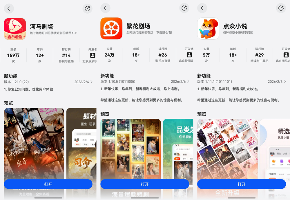 国内免费短剧 TOP 级平台河马剧场、「精品院线」式平台繁花剧场及具备海量数字阅读 IP 的点众小说三款应用深度融入鸿蒙生态,通过华为账号一键登录、桌面卡片一键直达、碰一碰快速分享三招,为我们春节追剧与阅读之旅,铺设了一条无比顺畅的「高速轨道」。