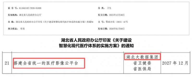 2025 年 12 月 30 日,湖北省政府办公厅印发《关于建设智慧化现代医疗体系的实施方案》的通知,更加明确了重点任务:建设全省统一的影像云平台。
