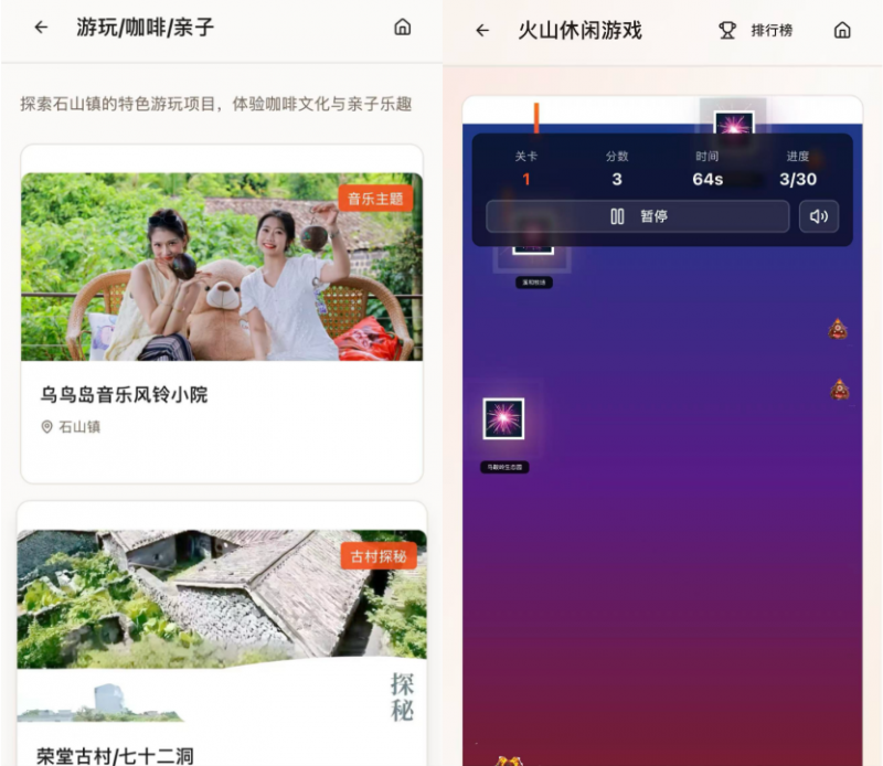 从火山小镇的概况到火山口地质公园的一站式导览,再到便民信息发布平台、火山休闲游戏,甚至是方便游客交流信息的火山若比邻聊天室,「玩转火山」应用精准解决了石山镇文旅发展的诸多痛点:让 4A 景区火山口地质公园有了数字化官网载体,让石山的半日游转向一日游、多日游,让本地村民有了信息流转的平台,也让火山石斛、石山壅羊等特色产业有了更广阔的展示窗口。