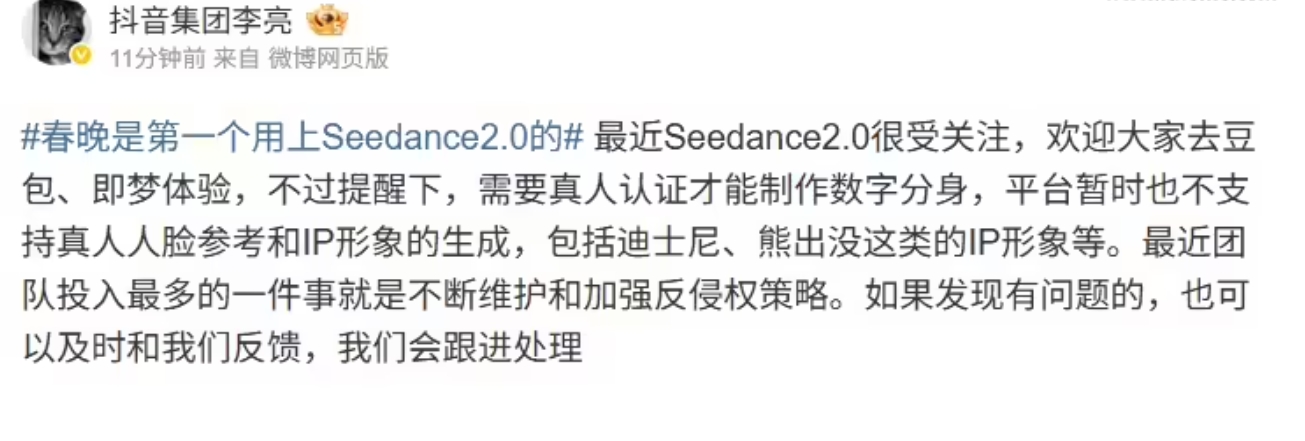 2 月 15 日消息,今日,抖音集团副总裁李亮在社交平台发文称,「最近 Seedance2.0 很受关注,欢迎大家去豆包、即梦体验,不过提醒下,需要真人认证才能制作数字分身,平台暂时也不支持真人人脸参考和 IP 形象的生成,包括迪士尼、熊出没这类的 IP 形象等。最近团队投入最多的一件事就是不断维护和加强反侵权策略。如果发现有问题的,也可以及时和我们反馈,我们会跟进处理收起。」